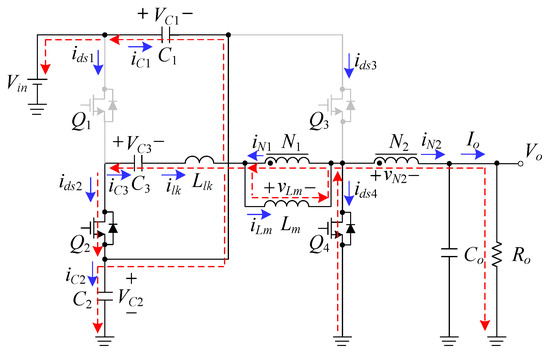 As shown in Figure 8, the switches Q2 and Q4 are still in the on-state but the switches Q1 and Q3 are still in the off-state. During this state, the magnetizing inductance Lm and leakage inductance Llk are still demagnetized, transferring their energy to the load. At the same time, the capacitor C3 charges the capacitor C2 and, together with the capacitor C1, releases energy to the input voltage Vin. Once Q2 and Q4 are turned off, this mode ends at t = t5.