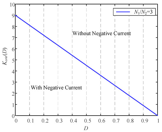 From (16), it can be seen that as K ≥ Kcrit(D), the magnetizing inductance Lm will be operated without negative current; otherwise, Lm will be operated with negative current. Hence, by assuming that N1/N2 = 3, the boundary curve for Lm operating mode can be drawn as shown in Figure 11.