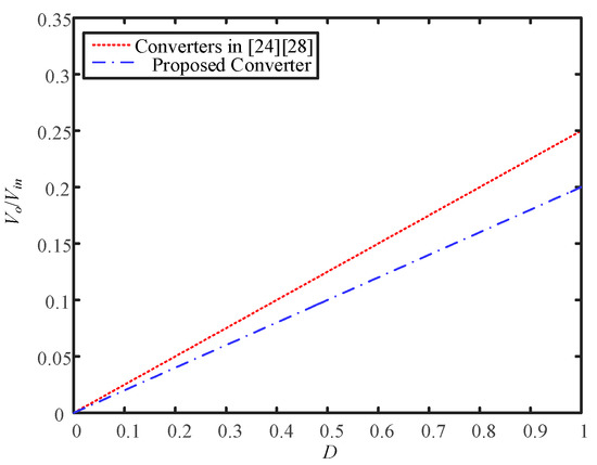 Table 1 shows the comparison of the proposed circuit with the existing circuits, in terms of voltage conversion ratio, component number, switch voltage stress, and output inductor. From Table 1, the proposed circuit has a more component number than the circuits shown in [24,28] have. As shown in Figure 12, the proposed circuit has a lower voltage conversion ratio than the circuits shown in [24,28] have. In practice, the lower the turns ratio n (= N2/N1) is, the larger the leakage inductance. Consequently, the value of n, set at 1/3 for the comparison in step-down voltage conversion ratio, is reasonable. The proposed circuit has lower voltage stresses on Q1 and Q2 than the circuits shown in [24,28] have. In addition, the proposed circuit has lower voltage stresses on Q3 and Q4 than the circuits shown in [24,28] have. In addition, only the circuit shown in [28] has an output inductor.