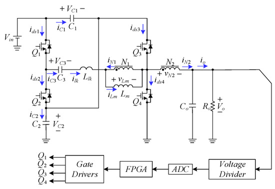 Figure 13 shows the system block diagram for the proposed high step-down converter, including main power stage and feedback control circuit. As for the feedback control circuit, it is constructed by one voltage divider used to obtain the analogue signal of the output voltage, one analogue-to-digital converter (ADC) used to transfer this analogue signal to the digital signal, and one field-programmable gate array (FPGA) chip used to generate four digital pulse-width modulation (DPWM) signals, which are sent to four switches after four gate drivers so as to stabilize the output voltage at the desired value. Speaking lucidly, the digital signal obtained from the ADC is sent to the proportional-integral (PI) controller embedded in the FPGA to create DPWM signals, vgs1, vgs2, vgs3 and vgs4, where vgs1 equal to vgs2 is complimentary to vgs2 equal to vgs4.