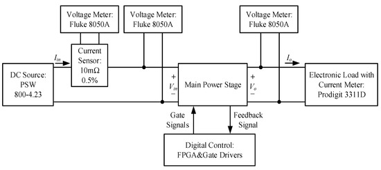 In the following, how to measure the efficiency will be described. First, as shown in Figure 14, the input current is obtained by measuring the voltage across one current sensing resistor based on one digital meter. After this, the input voltage is obtained also by another digital meter. Hence, the input power can be attained. Regarding the output power, the output current is read from one electronic load and the output voltage is obtained also by the other digital meter. Therefore, the output power can be attained. Finally, the corresponding efficiency can be obtained. As for measured waveforms, they are obtained by the instruments shown in Figure 14, along with two additional current amplifiers, two additional current probes and one additional isolated oscilloscope.