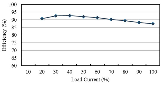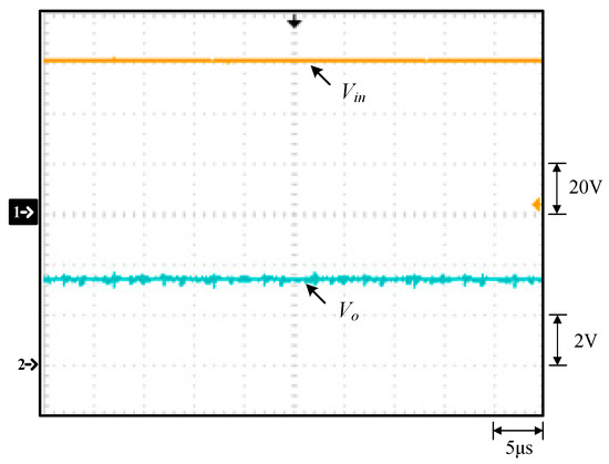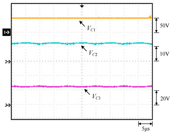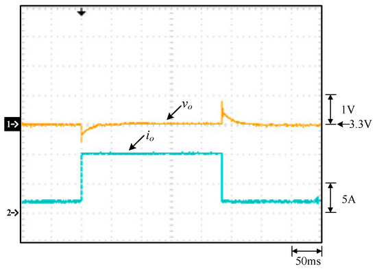From Figure 15, it can be seen that the voltage stress across Q1 is 48 V, equal to Vin minus VC2 (= 60 V − 12 V), whereas it can be seen that the voltage stress across Q3 is 12 V, equal to Vin minus VC1 (= 60 V − 48 V) with the voltage spike on Q3 due to the parasitic capacitance of the switch resonating with the line parasitic inductance and the leakage inductance of the coupling inductor. From Figure 16, it can be seen that the voltage stress across Q2 is 48 V, equal to Vin minus VC2 (= 60 V − 12 V), whereas it can be seen that the voltage stress across Q4 is 12 V, equal to Vin minus VC1 (= 60 V − 48 V). From Figure 17, the voltages on C1, C2 and C3, namely, VC1, VC2 and VC3, are almost kept constant at some values. From Figure 18, it can be seen that there are some differences in ilk and iN2 between the waveforms shown in Figure 4 and these measured waveforms. This is because the leakage inductance of the coupled inductor will resonate with the energy-transferring capacitors. From Figure 19, it can be seen that the output voltage can be stably kept at 3.3 V under the input voltage of 60 V. From Figure 20 and Figure 21, it can be seen that the switches Q1 and Q2 have ZVS turn-on since these two switches are switched on after individual body diodes are turned on, corresponding to states 1 and 4 in Section 2. Figure 22 shows the load transient response from light load to rated load with a undershoot of 600 mV and a recovery time of 30 ms, and the load transient response from rated to light load with an overshoot of 800 mV and a recovery time of 55ms. Figure 23 shows that the overall efficiency is above 87.4% and can be up to 92.7%.