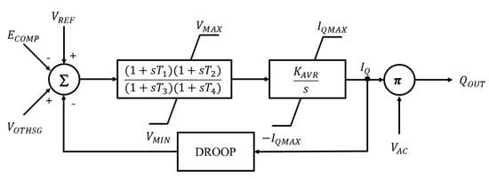 The reactive power controller is shown in Figure 4, and the reactive power order is determined by the controller. Voltage error between the connected bus voltage and the reference voltage determines the reactive current, after that, the signal passes through the lead-lag compensator to secure the output stability and the integrator to secure the control speed and multiplies the grid voltage to determine the reactive power output. Also, voltage control droop is applied in the control loop, and the model parameter can modify the percentage for the droop.