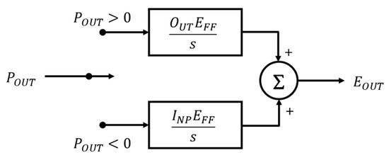 The charge and discharge state is determined by active power output. The ESS is operated as discharge mode when the active power output is larger than zero and charge mode when the output is lower than zero. The block diagram to consider the power conversion efficiency is configured as shown in Figure 5.