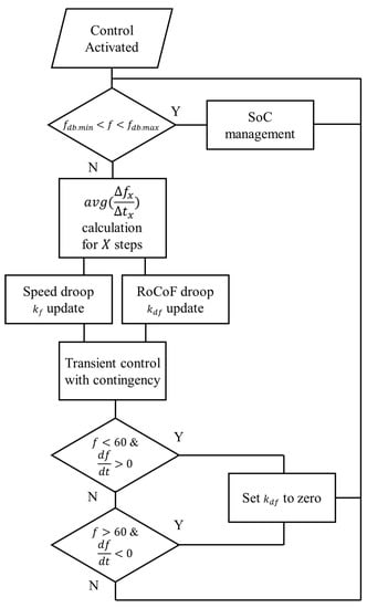 The FR-ESS control schemes based on the proposed methodologies described in Section 2 and Section 3 in detail. As shown in Figure 6, to utilize the adaptive droop control method, the information of the power system condition of frequency deviation () has to be collected by ESS main controller. Based on information such as with active power deviation, the system characteristics of effective inertia () can be assessed as described in Section 2. In the result, the main controller can calculate the droop coefficient for primary frequency response () and inertial response () appropriately. In the frequency recovery stage, a synthetic droop method is applied to prevent the frequency recovery delay caused by the inertial response, which leads to SoC management when entering the frequency dead band.