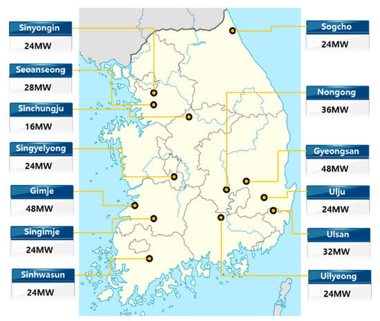 The demonstration project of the FR-ESS is in progress in real power systems in many countries [18]. In Korea, the ESS for FR applications is currently installed at about 376 MW capacity, as shown in Figure 7, and demonstrating its effectiveness in several contingency situations and capacity expansion is under review [25]. In this study, we assumed that the total capacity as 1 GW to study the effect of large scale ESS on the power system. The ESS capacity shown in the Figure 6 was approximately tripled.