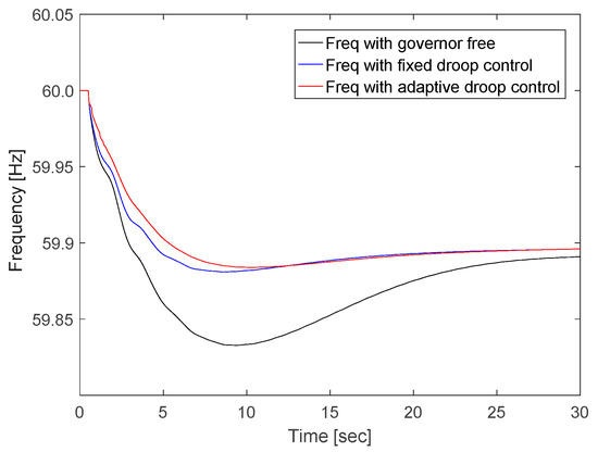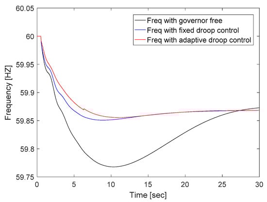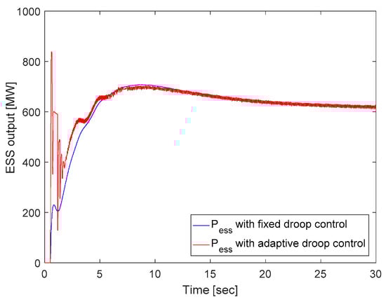 In the Korean power system, the largest capacity of the generator is 1460 MW NP, and we select the case with 1460 MW NP trip case. As shown in Figure 8, the thermal generators increase their active power to compensate for the frequency drop according to the generator outage as governor free action. The total amount is 1500 MW in this governor free capacity in the Korean power system. Figure 8 shows that the comparison between governor free with the thermal generator, ESS compensation with the fixed droop and with proposed adaptive droop control. In the steady-state point of view, three cases converged to a stable frequency operation point. However, there are significant differences in transient state. ESS is much faster than governor free, so RoCoF is smaller, and frequency nadir is also higher. The maximum limit is set to 0.2 with the proposed method. As shown in Figure 9 and Figure 10, the output is added to of conventional fixed frequency droop control. This supply the power additionally when the and the system frequency . In the result, the proposed method can lower the frequency descent rate and increase the frequency nadir.