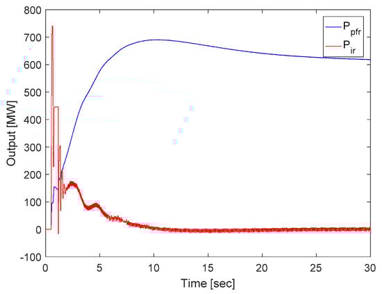 In the current FR-ESS operating scheme in Korea, if the frequency drops quickly beyond the dead band, the transient control method is applied to the ESS system [24]. However, dividing the operating modes may make it impossible to achieve stable and continuous frequency response. In this paper, the power output of the ESS system is controlled by the frequency variation and RoCoF by transient controller.