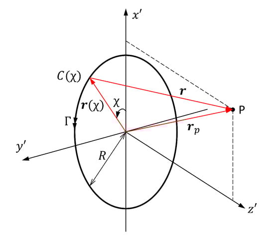 In the local vortex ring coordinate frame of an axis-symmetric vortex ring, the coordinates of P are and is located in the -plane, which centered at the origin of the -axis. Thus, Taking the notation and , we have