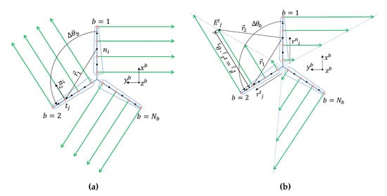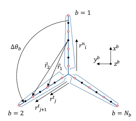 Figure 2 illustrates the blade bound vortex model for a rotor of blades with straight lifting lines assumption. Each blade is discretized with a series of vortex line segments. The radial endpoints on the vortex segments are denoted by , while the control points are denoted by , where ( and ), N being the number of vortex segments. A local blade coordinate system is defined as right-handed and centered at the rotor root. The -axis is along the pitch axis and pointing towards the tip of the blade; the -axis points to the trailing edge of blade and is parallel to the chord line at the zero-twist blade section; and the -axis is orthogonal to both and . In the local blade coordinate system of a blade b, the rotor lies in the -plane, as shown in Figure 2. The coordinates of a control point and an endpoint are then expressed as