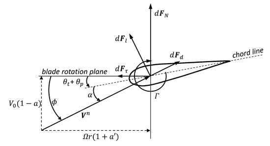 The Kutta–Joukowski lift theorem as introduced by Phillips [20] is adopted to solve the blade bound vortex strength. Based on this theory, the lift force acting on a vortex segment can be calculated by the product of the air density , the bound vortex strength on the segment, and the relative wind velocity , as