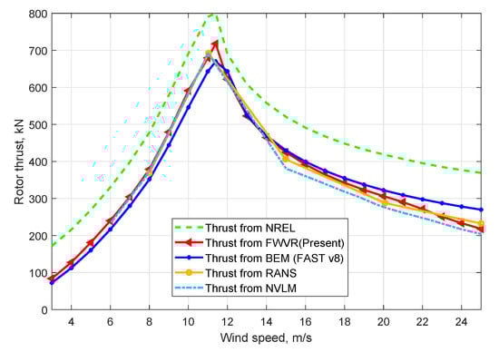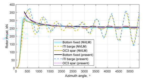 The multiple-DoF motion thrusts of ITI and OHS with the below-rated operating conditions as well as the fixed-rotor thrusts are compared with the results of [6] in Figure 13. It should be noted that, the platform motions start at a zero azimuth angle in the FWVR code while they start approximately after one rotation of the rotor in the NVLM code. Therefore, to facilitate the comparison, the thrusts from the present FWVR method is shifted with +360° along the azimuth angle-axis. It is found that the fixed-rotor thrust calculated with the present FWVR method is higher than that calculated with the NVLM method, which is consistent with the previous observation. Besides, the thrust amplitudes and frequencies of the two methods for the ITI and the OHS match well.