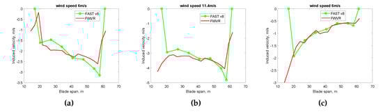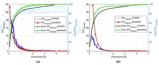 In general, the induced velocities are comparable between the two methods. As shown in Figure 14, the accumulated percentage of the induced velocity at distances 1D and 2D behind the rotor differ only by 2%, and this difference decreases to maximum 1.0% as the distance behind the rotor increases. Furthermore, the induced velocities from each section along the wake show similar trend with both methods, the big fluctuations being mainly influenced by the platform motions, particularly from the pitch. For the OHS below-rated condition (Figure 15a), a similar discrepancy is observed between the models, with differences of 2.4% and 2.1% at distances of 1D and 2D behind the rotor and 0.6% further downstream. In addition, the influence of the pitch and yaw platform motions on the induced velocity is relatively small. Above rated power (Figure 15b), slightly larger discrepancies are observed, with differences of 9.8% and 4.8% at distances of 1D and 2D behind the rotor and less than 1% further downstream. Additionally, the present FWVR method predicts significantly larger contribution of the induced velocity from the vortex rings within the 1D distance downstream. This is mainly because the vortex rings convect faster with the increase in wind speed, and the density of rings is sparser at higher wind speed. Because the induced velocity is very sensitive to the distance between the control points and the vortex ring (see Equation (21)) the contribution from the front rings is much more significant than that of the rings further away from the rotor. The small differences in the results can be explained from the differences in wake induction of these two methods. The first difference is that the induced velocities of the wake from the FWVF method are output for each vortex segment in the wake, while the induced velocities from the present FWVR method are output for each vortex ring. As explained in Section 4, there are fewer vortex rings than vortex segments in the wake, thus the induced velocities of the wake from the FWVF method are relatively constant compared to those from the FWVR method. The second difference is that, due to the different modeling properties, the induced velocities from the FWVF method start from a position very close to the rotor, while the induced velocities from the present FWVR method start from the position of the first vortex ring, and the induced velocity at the rotor from the near wake model is not accounted here.