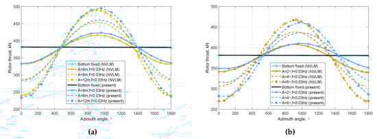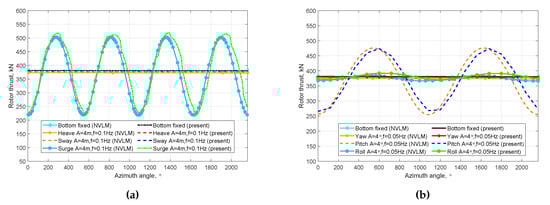 The effect of the surge and pitch motions with different amplitudes are further analyzed and compared with the results of [6] in Figure 9. Figure 9a compares the thrust with surge motions with the amplitude of 4 m, 8 m, 12 m and the frequency of 0.03 Hz, while Figure 9b compares the thrust with pitch motions with the amplitude of 2°, 4°, 6° and the frequency of 0.03 Hz. Since the amplitudes of the platform motions are small and the frequency is relatively low, the thrusts change linearly with platform motions for both surge and pitch.