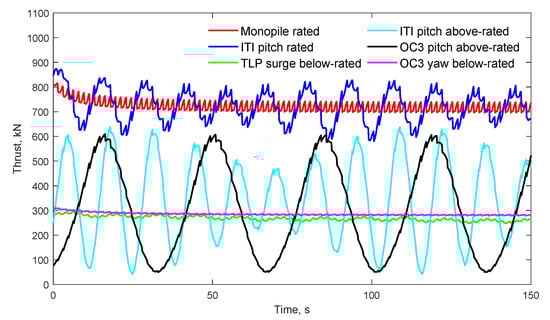 The thrusts are calculated with a wind speed of 8 m/s and a rotor speed of 9.16 rpm. The platform motions are defined as a sine function in Equation (56) with amplitude (A) and frequency (f) given in Table 2.