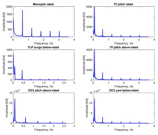 The rotor thrust of monopile in rated condition and five floating support structures in below-rated, rated and above-rated conditions are evaluated in time domain (Figure 10) and frequency domain (Figure 11). Figure 10 shows that the thrust fluctuate around their mean values, after an initial transient. The latter is due to the fact that a certain time is needed for the far-wake vortex rings to develop. Thus, initially, only the near wake mostly contributes to the values of induced velocities. After about 50 s, a steady-state is reached and statistics can be taken. Figure 11 highlights the dominant frequencies in the rotor thrust. For a bottom-mounted turbine on a monopile in rated conditions, the first dominant frequency is at about 0.6 Hz, which corresponds to the vortex shedding frequency. Higher frequencies are multiples of the first one. This is due to a periodic process whereby the thrust force reaches a minimum value when the induced velocity reaches a peak value, and vice versa. For the FOWTs, without exception, the frequencies of the platform motions dominate in the frequency of the thrust force. This is because the velocities induced by the platform motions are larger than the induced velocities from the vortex rings.