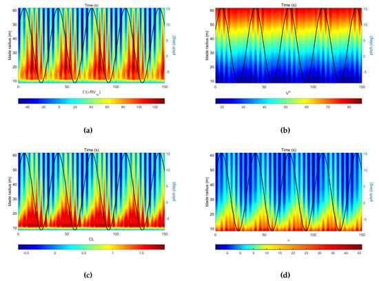where c is the chord length, is the lift coefficient and is the normal wind speed. The time evolutions of , , and are shown in Figure 12, for the OHS above-rated condition. In each figure, the continuous line represent the platform pitching motion. The non-dimensional (Figure 12a) fluctuates with the platform pitch motion. In addition, the high-frequency oscillation with the period of about 4.96 s is due to the rotor tilt angle. On the outboard of the blade, there are negative values of , which is consistent with the negative values of and observed in the same conditions (Figure 12c,d). The normal relative wind speed is less influenced by the platform motion and the rotor tilt, its main fluctuations coming from the constant rotation of the rotor.