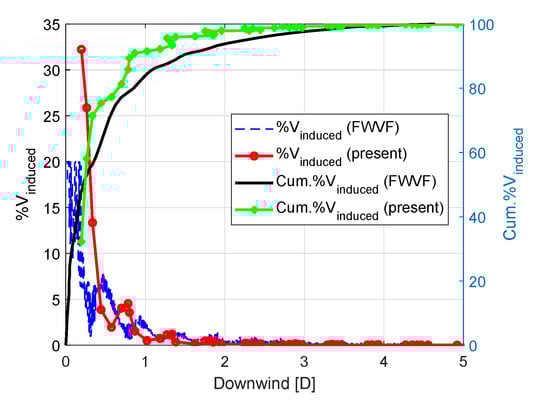 The wake induction at the rotor as a function of the downstream distance of the vortex rings are computed as the percentage of the total induced velocity at the rotor, and compared with [5] in Figure 14 for the ITI and in Figure 15 for the OHS with the NREL 5 MW wind turbine. The blue dashed lines represent the contribution of the induced velocities from each section along the wake as obtained with the FWVF method, while the red lines are the results of the present FWVR method. The red circles on the line highlight the position of the vortex rings. The black lines and the green dotted lines represent the accumulated percentage of the induced velocities along the wake from the FWVF method and FWVR method, respectively. The induced velocity data output from the present FWVR method was captured at the operating time of 150 s, when a stable condition was reached by the wind turbine. Since the convection of the vortex rings downstream is a dynamic process, the induced velocity captured at different time steps can be slightly different.
