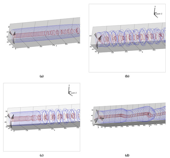 The wake structures of the bottom-fixed wind turbine with the specified below-rated operating condition as well as the FOWTs with the three multiple-DoF platform motions at 150 s of the operating time are shown in Figure 16. The inner and outer rings are distinguished with red and blue colors, respectively, with the vectors indicating the directions where the control points are moving in the next time step. The wake structures of the below-rated operating conditions, as shown in Figure 16a–c, are found to be more compact than the above-rated operating conditions, as shown in Figure 16d, which is due to the different convecting speeds of the vortex rings in the wake in different free stream environments. The wake structure of the bottom-fixed wind turbine has homogeneous vortex ring radii since its blade bound vortex strengths are homogeneous. By contrast, the wake structures of the FOWTs have significant fluctuations because both the blade bound vortex strengths and the rotor position change with time, thus affecting the roll-up process of the wake model. Additionally, the vortex rings in the wake with uneven radii and vortex strengths interacting with each other can cause some fluctuations downstream in the wake, especially below-rated conditions for which the downstream vortex rings are relatively close to one another, which can be seen clearly in Figure 16b,c.