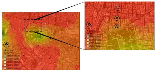 Madrid’s urban heat island (UHI) map on 26 July 2015 [,] and the selected northern region of the Retiro Park. Intersection A is in the yellow zone, intersection B is in the orange zone and intersection C is in the red zone, close to one of the UHIs of Madrid.