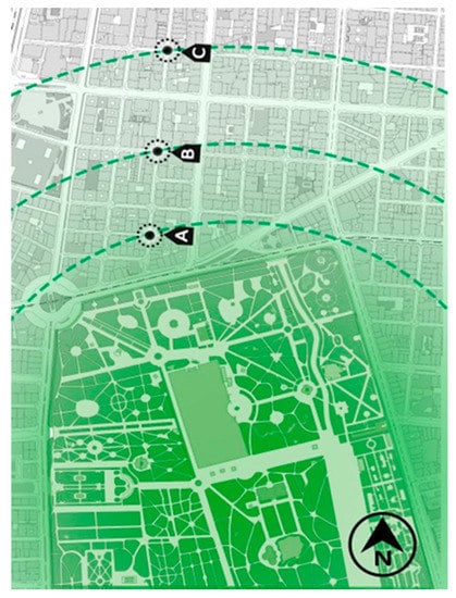 In order to accurately assess the cooling effect of Retiro Park on its surrounding areas, it was necessary to select places on a micro-scale with common features that are located at various distances from the park. The northern area of Retiro Park, due to its well-organized form, has more regular urban-type compared to other areas (east and south). Based on the temperature zones of the updated thermal map of Madrid’s urban heat islands in 2015 [], three street crossings (intersections) located in the Salamanca and Recoletos neighborhoods in the north of Retiro Park along the Lagasca Street, were chosen. These sites were located at 150 meters, 380 meters and 665 meters from the park at Lagasca intersection with the Conde de Aranda, Jorge Juan and Hermosilla streets, giving zones of different temperature ranges (yellow, orange and red; Figure 1). These types of selected local intersections represent most of Retiro Park’s northern area intersections (Figure 2). Based on this map [,], each of the three intersections A, B and C had a temperature difference of about 0.8 °C.