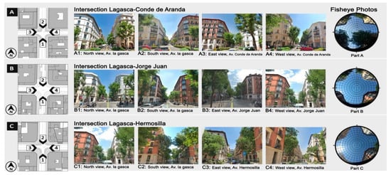There were two priorities in selecting the intersections. Firstly, the points were selected according to Madrid’s UHI map (Figure 1) where the distances were of different temperature ranges, and secondly, locations were selected that shared the greatest similarity in terms of physical and structural traits. In this vein, three sites A, B and C were selected to extract data, in accordance with the goals of this study.