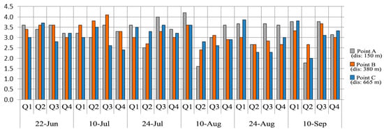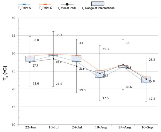 Data was gathered during six days in hot summer, on 22 June, 10 and 24 July, 10 and 24 August and 10 September at three different intersections at different distances from the northern area of Retiro Park (Table 2). The selected data collection time interval was generally between 10:40 and 12:10 CEST (the exact time of each intersection is given in Table 2). This time was chosen since it was between the maximum and minimum temperatures in the park, so the temperature data extracted at points A, B and C were close to the average park temperature (mid-temperature taken by the AEMET weather station [] on the data extraction days; Table 6). Based on Figure 6, the temperature range for points A, B and C (gray rectangle) was between the maximum and minimum extracted park temperature (linear range). It is noteworthy that among the three areas, the average temperature of point A was closer to the average temperature of the park (mid-temperature; Table 6) compared to the other points. AEMET data showed that the lowest and highest temperatures pertaining to the data extraction days in the Retiro Park were related to the 4:50–6:00 and 13:40–14:40 CEST timeframes.