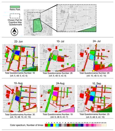 SPSS software was utilized, according to the statistical data obtained from the questionnaire to examine the significance of the data in three selected intersections, and also to examine the significance of the relationships between various indices with PTC [,]. In order to examine cognitive maps more accurately, AramMMA software was used []. In this program, all the cognitive maps were overlapped, and then according to the color spectrum, it determined which locations had the most point of reference (Figure 5). Each color represents the number of pointing a location (for example red means one time or purple means 12 times). In order to convert the qualitative data of cognitive maps into quantitative data, inside the AramMMA software, the Retiro area was rated, so that 100 percent of the score was dedicated to the maps that noted parks, while zero percent was considered for those that did not mention to the park. By using the cognitive map analyses, the importance of park cooling effect on resident psychological thermal comfort in different parts of the Retiro Park was represented.
