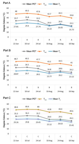Values of the Tmrt (°C) and average values for physiological equivalent temperature (PET; °C) in part A, B and C.