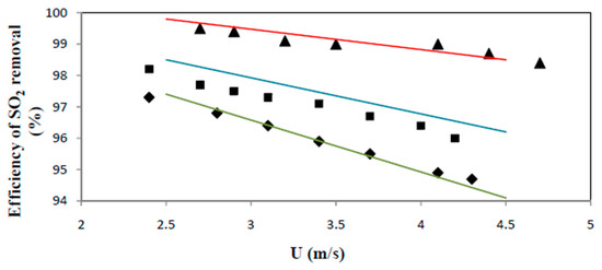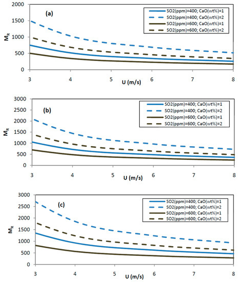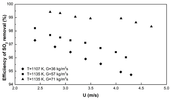 The results will be further compared with model predictions in Section 5. An increasing G increases the efficiency of SO2 removal, irrespective of U. Increasing values of U at a given G reduce the removal efficiency. Both effects are in accordance with the hydrodynamic expectations: An increasing U will reduce the SO2-CaO contact (residence) time, thus reducing the reaction potential; an increasing G on the contrary will increase the amount of CaO present in the riser, thus enhancing the reaction by the increasing CaO/SO2-ratio [44]. These effects will also be further discussed when model equations are applied.