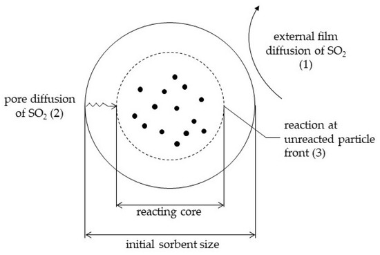 The reaction of the solid reactant with SO2 follows a first order kinetics in SO2, provided O2 is present in high concentrations [45,46]. This is always the case in combustion flue gases in view of the legal obligation to emit them into the atmosphere at minimum 6 vol % O2.