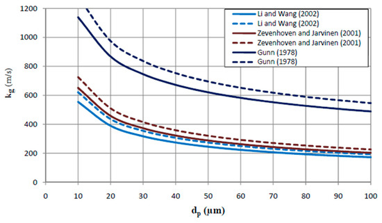 Equations for the Sherwood number are given by Li and Wang [49], Zevenhoven and Jarvinen [50], and Gunn [51]. A CFB combustor, the UPM-Kymmene (UK) Ltd (Caledonian paper mill, Irvine, Ayrshire, Scotland, UK) application with a riser of 3.783.78 m2 being a typical example, operates at temperatures between 1023 K and 1173 K, with small particles (Ca2+-reactant is injected with particle size ≤74 μm). The slip velocities, being the difference of the superficial gas velocity, U, and the calculated terminal (free fall) velocity of the particle, Ut, are around 3 m/s [52]. Application of the literature equations leads to the following predictions of kg, as illustrated in Figure 7.