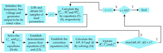 Considering that the solving process of the stochastic load model is converted into a total of NS deterministic PF problems through samples of LHS, the following narration of this problem focuses on the deterministic problem. For a certain deterministic sample s, the rated loads and and load parameters , , and are all determined values. Assume that the initial values of the system frequency, bus voltage and generator output are all at their expected values. When the rated loads are equal to the expected values, the system operates in the rated conditions. If the rated load of the sample s is not equal to its expected value, the power shortage of the system can be obtained via Equation (7), which ignores the change of the power loss. Equations (8) and (9) are adopted to calculate the variation of the frequency and the output of each generator according to the amount of power shortage. That is, the active power shortage resulting from the load fluctuations can be balanced by the static characteristics of the load and the adjustment on the generator output, while the reactive power shortage is depressed by the generator excitation system: