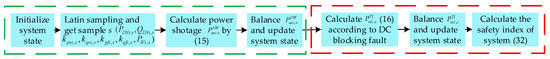 where is the maximum active power output of the generator, while and are the adjustment rate and allowed adjustment time of the generator, respectively; the value of is set as 5% . is the expected frequency after the load shedding. is the load-shedding coefficient, and it satisfies , which is defined in Section 3.3. The actual active and reactive power of the loads can be updated according to Equations (25) and (26). Then, the PF equations of the system can be established according to Equations (12) and (13), and the initial values of the state variables are , and . After solving the PF equations according to the iterative method in Section 2.2, the frequency , actual load , voltage magnitude and phase angle can be obtained after the DC blocking fault while taking into account the fluctuations of the wind power and load for the sample s. The active PF of each branch can be obtained in combination with Equation (27). Finally, the comprehensive security index of the system after the DC blocking fault can be obtained according to Equation (32) in Section 3.4.