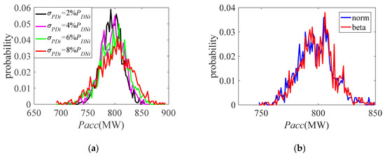 To analyze the influence of the randomness of the rated load and wind power output on the power shortage, different standard deviations of the rated load and different distributions of the wind power output are adopted. The standard deviations are set as 2%, 4%, 6% and 8% of its expected value at the rated condition, respectively; and normal and beta distributions are adopted to describe the wind power output for the latter when the other conditions are identical to the base case. The power shortage distributions are shown in Figure 3, where Figure 3a corresponds to the randomness of the rated load, while Figure 3b corresponds to the randomness of the wind power output.