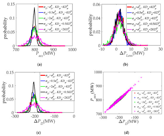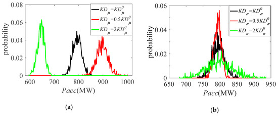 To compare the influences of the randomness of the rated load and load static characteristics on the power shortage after the DC blocking fault, Figure 5a shows the distributions of the power shortage with different and values. It is assumed that and represent the standard deviation set and the original standard deviation set of the rated load in the power system, respectively.