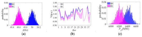 It can be seen from Figure 4 that the variation of the load parameters will lead to the distribution change of the power shortage after the fault. The smaller the expectation and standard deviation of the power shortage are, the larger the after the fault is. When the varies, the expected value of the power shortage after the fault is almost the same, while the standard deviation of the power shortage increases with the . The system frequency and the bus voltage will drop after the DC blocking fault, and hence the actual load will decrease, as seen in Equation (5) of the load model, which results in the actual power shortage being lower than the power lost by the DC line. The larger the is, the larger the actual load varies with the operation state of the system; consequently, the smaller the actual load and the expectation of the power shortage are after DC blocking. The larger the is, the larger the interval corresponding to the actual load distribution is, and the larger the interval and variance corresponding to the actual power shortage distribution are. By comparing the power shortage distribution in Figure 4a,b, the influence of the changes in on the power shortage distribution is more significant than that of . In general, the changes of and are achieved according to the distribution of the load parameters, hence determining the actual distribution of the total system load and power shortage after the fault.