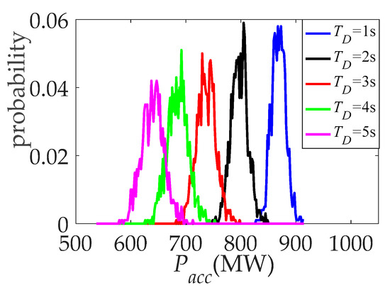 The high power deficiency after the fault needs to be balanced in time, and its response speed will affect how to balance the power deficiency. The accurate calculation of the power deficiency can determine effective countermeasures against its emergence, so that the system can quickly return to the normal state, and vice versa. In fact, the inertia effect of the generator exists during the response delay of the actual system, so there is a significant error of the power shortage when the inertia effect of the generator is not taken into account. Therefore, it is necessary to introduce the inertia effect of the generator to calculate the accurate power deficiency for the high power imbalance fault. To further illustrate the role of the inertia effect of the generator, the response delay time is changed to obtain the distribution of the actual power deficiency in Figure 7.