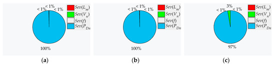 To illustrate the influence of the different load shedding schemes on the system security after the DC blocking fault, the load-shedding coefficients of each bus, according to Section 3.3, are used to obtain the security index of the system after the fault. When the load-shedding coefficients , and are employed, the corresponding security index values are 31.3423, 26.7135 and 11.8081, calculated individually via Equation (32). To validate the effectiveness of the new security index proposed in Section 3.4, the compositions of the comprehensive security index Sev with different load-shedding coefficients are shown in Figure 8. It can be seen from Figure 8 that no matter which load-shedding coefficient is adopted, the severity of the load distribution shifting contributes to the main block to the system safety index. On the one hand, this result shows that the introduction of the load-shifting severity index plays an intuitive and important role in the system safety index. On the other hand, it indicates that the voltage magnitude, frequency and branch power can be guaranteed to slightly exceed the limit or not exceed it at all via the use of the load-shedding strategy after the fault, which also benefits from the accurate determination on the power deficiency in the previous step.