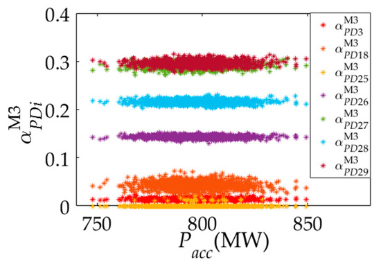 As can be seen from Figure 9, if the actual power deficiency of the whole system varies in the stochastic context, the load-shedding coefficient of the same bus could be different. Even if the actual power deficiency is the same, the load-shedding coefficient of the same bus will be different due to the different operation states of the system. However, the change of the load-shedding coefficient, along with actual power deficiency for the same bus, is small and can be treated as a constant, but this is not investigated in the other two load shedding strategies where and are adopted. The load shedding coefficients for M3 remaining approximately constant values can be explained by the fact that the PF tracing result of each load bus varies almost linearly with the power deficiency, which leads to the unchanged value of for the different samples. Therefore, the expectation of the load-shedding coefficient is adopted for the different actual power deficiencies under the stochastic context. In addition, the security index of the system is 11.9091 when is used as the load-shedding coefficient. This shows that the system security is still basically unchanged when is adopted as the load-shedding coefficient as compared to , but more importantly the deterministic coefficients achieved for the load-shedding strategy are more practical.