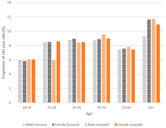 Visual inspection of Figure 3 reveals that the age/gender breakdown in the sample is broadly representative of that in the UK, with the exceptions that men aged 25–34 appear to be under-sampled, while men aged over 65 are over-sampled.