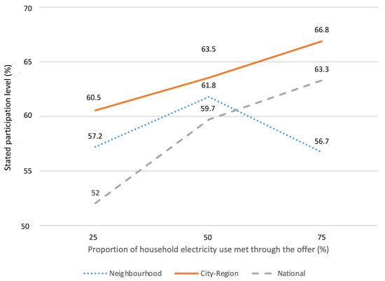 As can be seen in Figure 4, stated uptake in our sample generally increased as the proportion of consumption met increased, except at the neighbourhood level, where it fell at 75% of consumption met to roughly the same value as at 25% of consumption met. The city/region level of spatial scale prompted the highest stated uptake at all levels of consumption met. Uptake at this scale had the highest value of all groups at 66.8% uptake, where 75% of consumption would be met through the scheme.