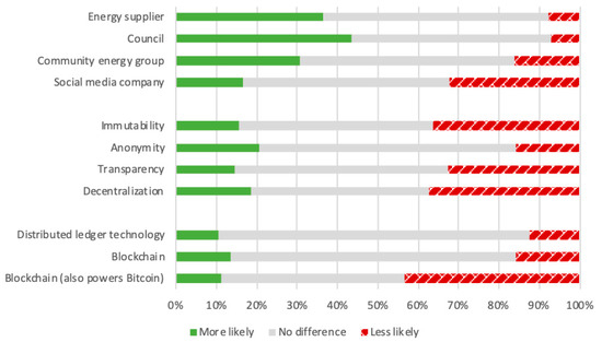 As can be seen in Figure 5, in Experiment 2 (in our sample), the council was the entity most likely to make people want to participate in the P2P trading scheme, followed by the energy supplier, community energy group and finally the social media company. In Experiment 3, no condition makes participation particularly more attractive than the others. However, anonymity is substantially less off-putting than the others—that is, more than twice as many people said they would be less likely to participate if shown the immutability, transparency or decentralization scenarios compared to the anonymity one.