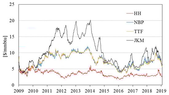 We select natural gas price indicators for the North American, European, and Asia–Pacific markets. We use Henry Hub (HH) futures as the North American index. HH is the name of a distribution hub in Louisiana for the natural gas pipeline system in North America, referring to natural gas delivered at that hub. HH futures are listed on the New York Mercantile Exchange. We adopt National Balancing Point (NBP) and Title Transfer Facility (TTF) futures as the European index. NBP futures are futures of natural gas at a virtual trading location in the United Kingdom, being listed on the Intercontinental Exchange (ICE). This market is related to production in the North Sea gas field, which is trading with the European continent by pipelines, and consumption within the United Kingdom. TTF futures are the futures of natural gas at a virtual trading point in the Netherlands, being listed on the ICE. This market reflects the continental European market, which consists of trading by long-haul pipelines and LNG. We utilize the Japan/Korea Marker (JKM) as the Asia-Pacific index, which is associated with the short-term trading market for LNG in the Asia–Pacific region. It is provided by Platts, which assesses benchmark prices in physical energy markets. We obtain the daily data from February 2, 2009 to February 28, 2019 from Bloomberg.