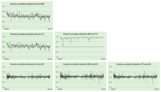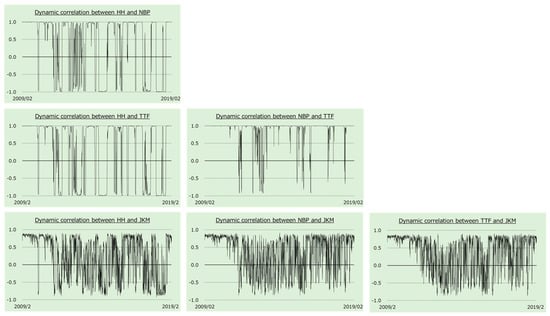 Figure 2 provides the time series of the dynamic correlation coefficients between each pair of return series. Although the NBP and TTF have the highest correlation coefficient in Table 4, even that dynamic correlation coefficient temporarily decreases to 0. Conversely, even if a correlation coefficient over the entire period is low, the dynamic correlation coefficient may temporarily increase.
