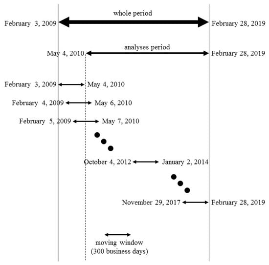 It is insufficient to focus on static spillover indicators, which are calculated by the Diebold and Yilmaz [] and Baruník and Křehlík [] for the entire period. To capture the dynamics of the spillover effects, we employ the rolling window approach as a sampling method. As shown in Figure 4, this study fixes the moving window sample size to 300 trading days and offsets the window by one business days every time we perform an analysis.