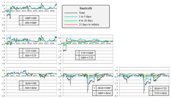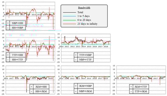 Figure 7 traces the pairwise connectedness of the return series and the results of its spectral analyses. In all combinations, the spillover effects of the return series continue to depend on short-term factors. Compared to the total connectedness, which is stable at around 30%, the pairwise connectedness between any variables is low and stable, although the pairwise connectedness from NBP to JKM and from TTF to JKM temporarily reaches around 3%. The mutual spillover effects offset each other because they are almost at the same level. However, when the Asia-Pacific spot market becomes tight or loose, the European market might be relatively stronger than the Asia-Pacific one.