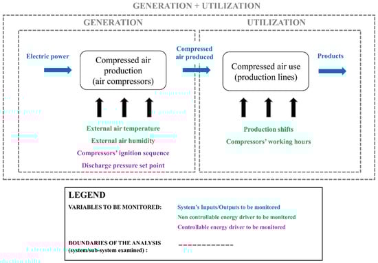 Figure 1 gives a schematic representation of the most common variables to be monitored for CAS and the different possible boundaries of the analysis. Compressed air generation and utilization are represented together with their main inputs/outputs and all the main variables that are capable to influence the energy performance of the system, also called “energy drivers” [19]. Energy drivers are divided into two categories, i.e., controllable and non-controllable. Controllable energy drivers can be modified by the companies and set by operators, while non-controllable energy drivers cannot be modified (either because out of company’s control, such as weather conditions, or because the company is not willing to change them to improve energy efficiency, such as production rates and working hours).