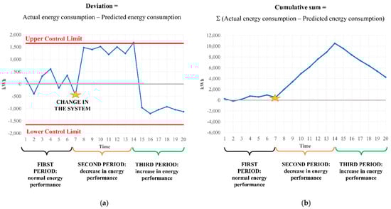 Qualitative representation of the two control charts applied for the joint analysis of energy behavior of a system: (a) control chart for energy performance deviations and (b) the cumulative sums chart (CuSum) chart. In the first period of the analysis (time interval from 1 to 7) the energy behavior of the system is normal, whereas in the second period (time interval from 7 to 14) the charts show a decrease in energy performance (positive shift of the average in (a) and upward trend in (b)). In the final period (time interval from 14 to 20), the system shows an improvement of the performance (negative shift of the average in (a) and downward trend in (b)).