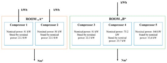 The maximum compressed air production was higher than the maximum compressed air demand, and usually only two or three compressors work simultaneously. Only Compressor 5, located in room “B” had a variable speed drive installed, and it served as “master” (continuously functioning), while the others worked as load/unload and served as “slaves”. A central control system regulated the compressors in accordance with compressed air demand. Some general information on the compressors (nominal and stand-by nominal power) is reported in Figure 4. Data related to energy consumption and compressed air production, as well as compressed air pressure, external air temperature and humidity were available with a 15 min frequency (i.e., already collected, recorded and stored in the company’s servers), while the number of hours worked by each compressor was available weekly (cumulated).